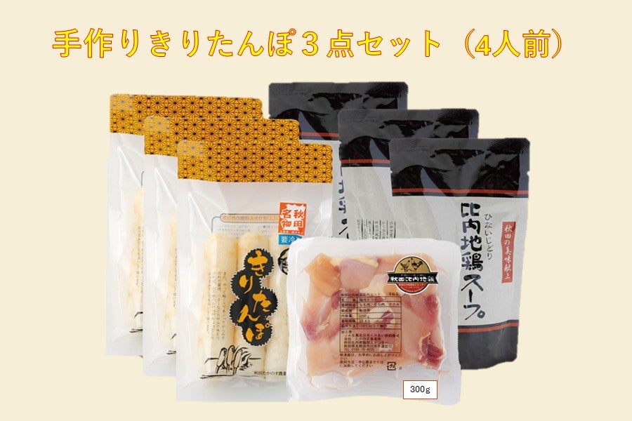 「秋田県産比内地鶏」・「きりたんぽ」・「比内地鶏スープ」の3点セットです。