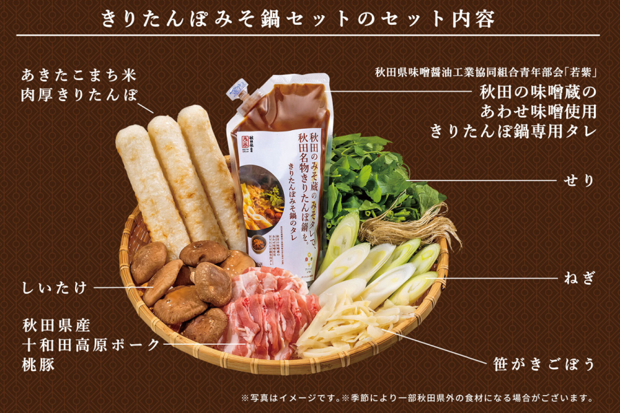 「きりたんぽ鍋」は、比内地鶏のダシが効いた醤油ベースのスープでいただく秋田の県民食です。 秋田では醤油が広く使われるようになる幕末期以前、みそが主な調味料として使われていました。 甘味・うま味の多い秋田みそをベースに秋田県産食材を多く使用した「きりたんぽみそ鍋」は、古来伝承の味の復活でもあります。 美味しい秋田みそを使用した「きりたんぽみそ鍋」を、ぜひご家庭でお試しください。