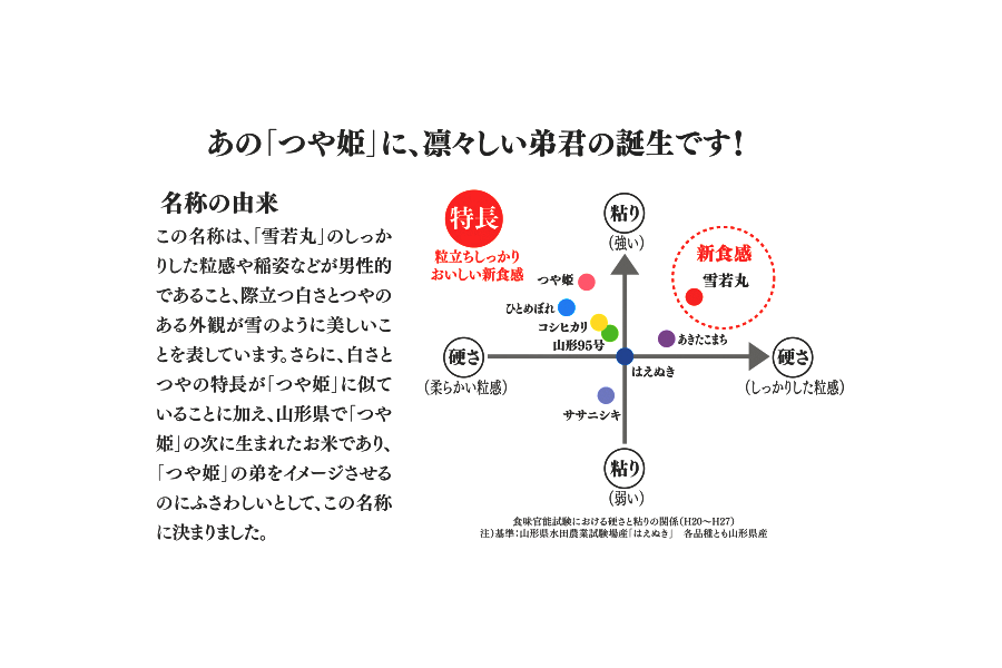 令和7年産 雪 若 丸 炊き上がりは、雪のように白く輝き、 しっかりとした粒感 と 適度な粘り はまさに 新 食 感 です!! 「つや姫」の弟分として、力強く、凛々しく、 たくさんの笑顔としあわせを食卓にお届けします♪ ※「のし」をご希望されるお客様は必ずご自身で 「のし」をご指定下さい。 ※ご指定のない場合は「のし」はお付けできませんので予めご了承下さい。