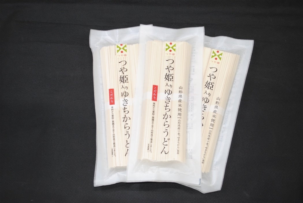 稀少な山形県産小麦「ゆきちから」と山形県が誇るブランド米「つや姫」の米粉を使用した新商品です。 夏はつるっと「ざるうどん」、冬は山形名物のあつあつ「ひっぱりうどん」に最適な麺に仕上げました。 贈答品にもお使いいただけます。