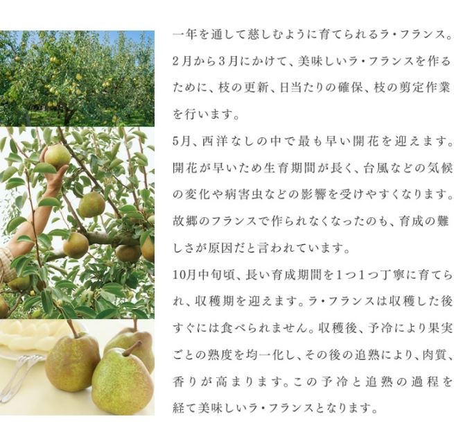 和梨はもぎたてが美味しいけど西洋梨は収穫後呼吸をしているので、"予冷追熟"することで柔らかく、甘くなります。JAてんどうではラ・フランス専用選果センターがあり予冷して出荷して