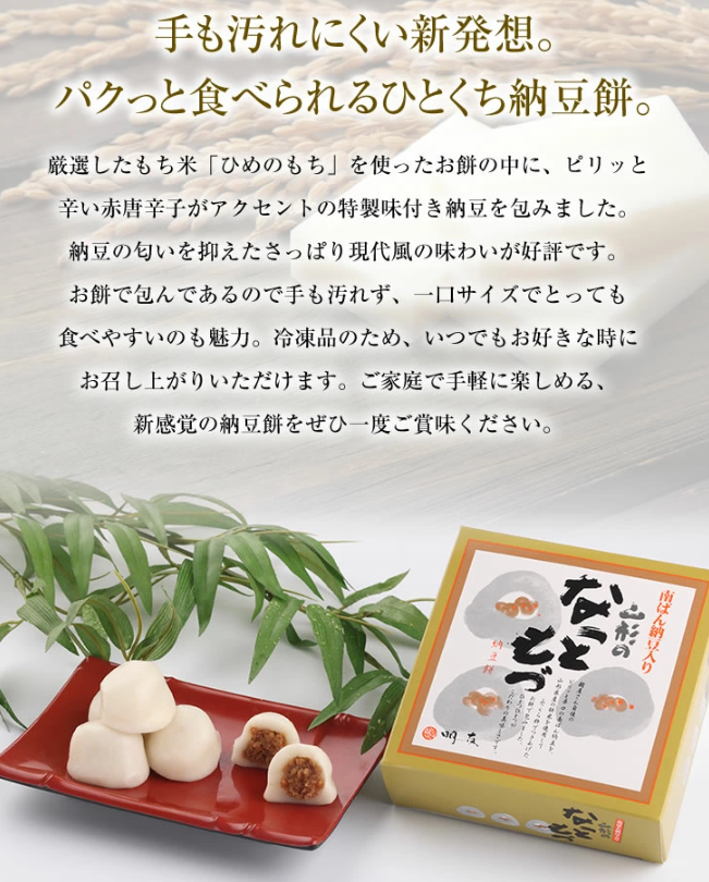 ピリッと辛い赤唐辛子を加えた味つき納豆を、厳選された「ひめのもち」で 包みました。 納豆の匂いも薄く、さっぱりした味は現代の趣向に合い、好評を得ています。 納豆はお餅で包んでいるため手に付きにくく、一口サイズで食べやすい新発想のお餅です。 冷凍保存ですのでお好みの時間に合わせてご賞味いただけます。