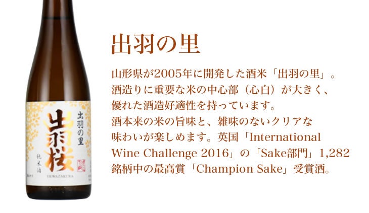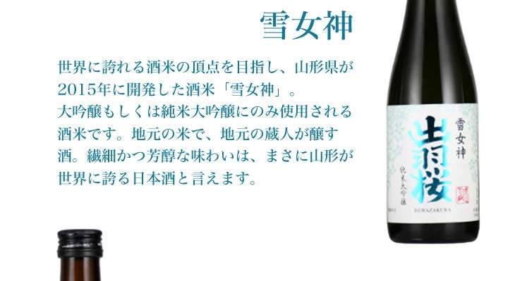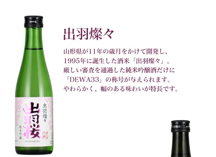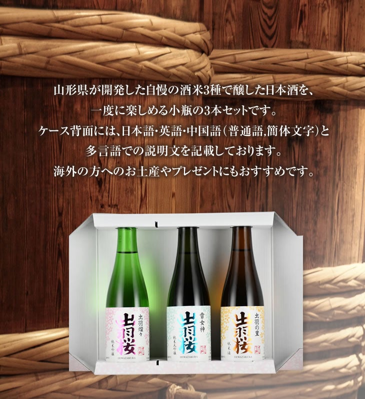 出羽桜酒造は山形県の内陸天童市で1892年に創業された酒蔵です。 「出羽燦々」「雪女神」「出羽の里」と県産自慢の酒米3種で醸した日本酒を、 一度に楽しめる贅沢な小瓶の3本セットです。 ・出羽燦々 山形県が11年の歳月をかけて開発し、1995年に誕生した酒米「出羽燦々」。 厳しい審査を通過した純米吟醸酒だけに「DEWA33」の称号が与えられます。 やわらかく、幅のある味わいが特長です 精米歩合50% アルコール度15度 ・雪女神 世界に誇れる酒米の頂点を目指し、山形県が2015年に開発した酒米「雪女神」。 大吟醸もしくは純米大吟醸にのみ使用される酒米です。地元の米で、地元の蔵人が醸す酒。繊細かつ芳醇な味わいは、まさに山形が世界に誇る日本酒と言えます。 精米歩合48% アルコール度16度 ・出羽の里 山形県が2005年に開発した酒米「出羽の里」。 酒造りに重要な米の中心部(心白)が大きく、優れた酒造好適性を持っています。酒本来の米の旨味と、雑味のないクリアな味わいが楽しめます。英国「International Wine Challenge 2016」の「Sake部門」1,282銘柄中の最高賞「Champion Sake」受賞酒。 精米歩合60% アルコール度15度 ■保存方法:直射日光を避け冷暗所保存