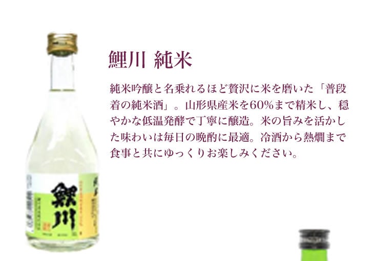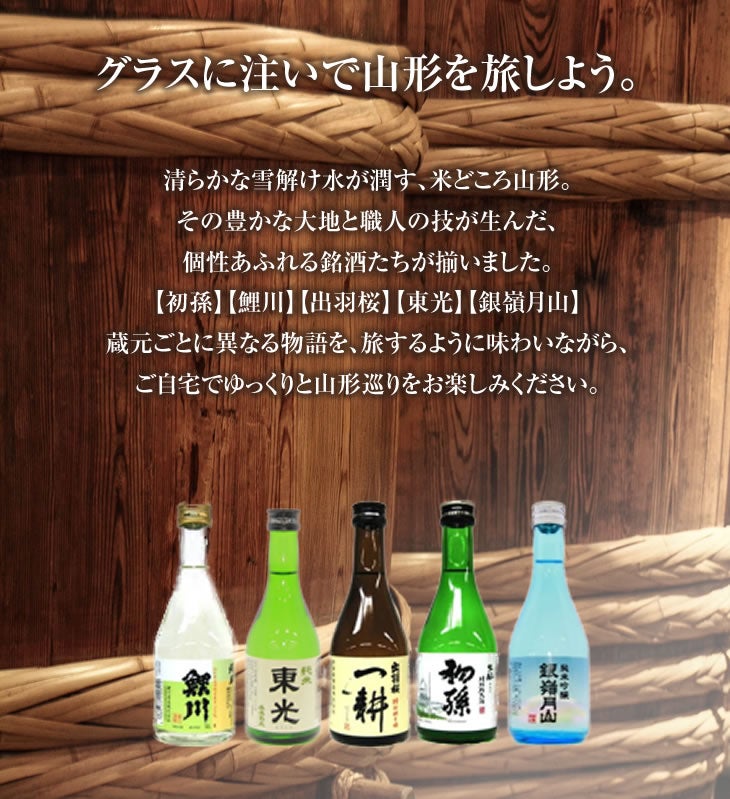 「海沿い酒田市東北銘醸の特別純米酒」「内陸天童市出羽桜酒造の特別純米酒」「米沢市小嶋総本店の純米酒」「庄内町鯉川酒造の純米酒」「月山麓寒河江市月山酒造の純米吟醸」山形県内随所の代表銘柄が飲み比べできるおすすめのセットです。 酒処山形県の日本酒5銘柄の飲み比べセット。 飲み切りサイズの300mlサイズで楽しめます。 初孫 特別純米酒 300ml×1 出羽桜 純米酒「一耕」 300ml×1 東光 純米酒 300ml×1 鯉川酒造 純米酒 300ml×1 月山酒造 純米吟醸酒 300ml×1 原材料名等 【鯉川 純米酒】 原料米:はえぬき・アルコール度:15.3度・日本酒度:+6・酸度1.5 【東光 吟醸】 原料米:山形県産米・アルコール度:15度・日本酒度:+6 【出羽桜 純米酒一耕】 原料米:山形県産米・他・アルコール度:15.5度・日本酒度:+3・酸度:1.4 【初孫 きもと純米酒】 原料米:美山錦・アルコール度:15.3度・酸度:1.4 【銀嶺月山 純米吟醸】 原料米:雄町・アルコール度15度・日本酒度+1・酸度:1.3