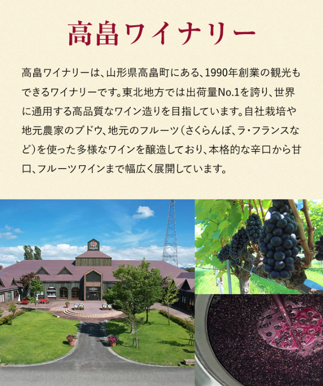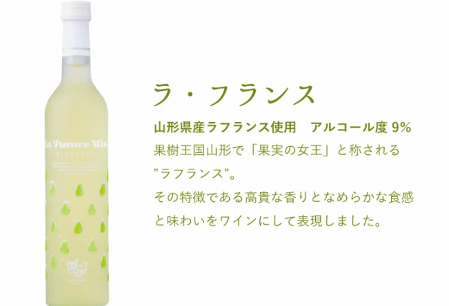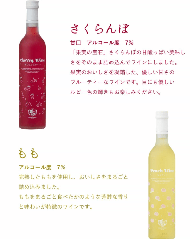 【さくらんぼ】 「果実の宝石」さくらんぼの甘酸っぱい美味しさをそのまま詰め込んでワインにしました。果実のおいしさを凝縮した、優しい甘さのフルーティーなワインです。目にも優しいルビー色の輝きもお楽しみください。 甘口 アルコール度 7% 【ラ・フランス】 果樹王国山形で「果実の女王」と称される”ラフランス”。その特徴である高貴な香りとなめらかな食感と味わいをワインにして表現しました。山形県産ラフランス使用 甘口 アルコール度 9% 【もも】 完熟したももを使用し、おいしさをまるごと詰め込みました。ももをまるごと食べたかのような芳醇な香りと味わいが特徴のワインです。 甘口 アルコール度 7% ■内容量:各種 1本500ml ■保存方法:直射日光を避け冷暗所保存