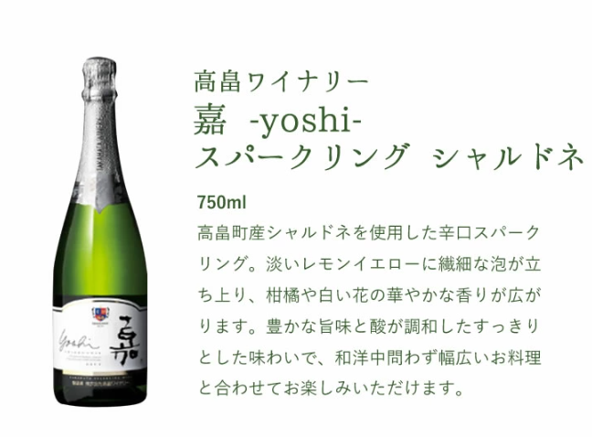 高畠町は全国有数のぶどうの産地。デラウェア、シャルドネの生産量は全国1位。また、国内外で高評価を獲得している高畠ワイナリー。高畠町産の完熟シャルドネ100%から造られております。