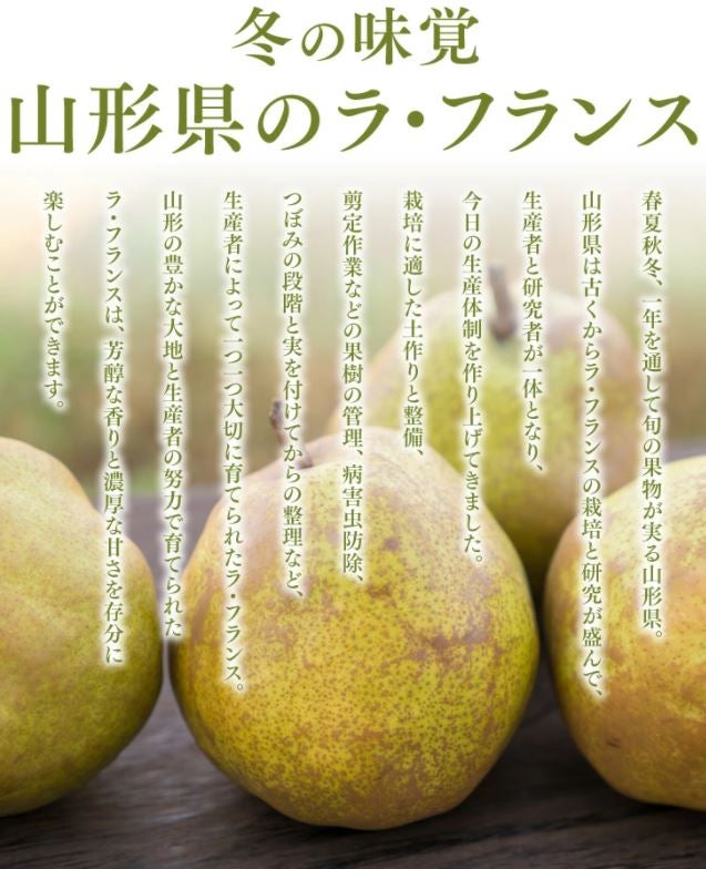 山形を代表する果物ラ・フランス♪ その中でもゴールドは舌触りが緻密でよりクリ―ミー! 希少価値で、通常ラ・フランスと食べ比べはいかがでしょうか? ・ゴールドラ・フランス 玉数おまかせ ラ・フランスのおいしい食べ方は軸の所にしわが出て、押せる様に成りましたら食べ頃です。 ご指定がない場合のしはおつけしておりません。