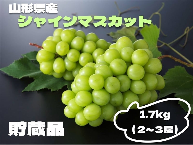 置賜産シャインマスカット 約1.7s 秀2〜3房 ※重量は箱込みの重量となります。ご理解をお願いいたします。 旬の時期に厳選したシャインマスカットを冷蔵し、冬でもお楽しみいただけるようにしました。 山形県の気候風土はぶどう栽培に適しており、小粒系の「デラウエア」から大粒系の「巨峰」、「ピオーネ」など、さまざまな品種のぶどうが生産されていますが、近年、特に人気の高い品種が「シャインマスカット」です。 美しい乳白色を帯びたグリーンの大粒、ストレートな程よい甘さに秘められた豊かな芳醇をお楽しみください。
