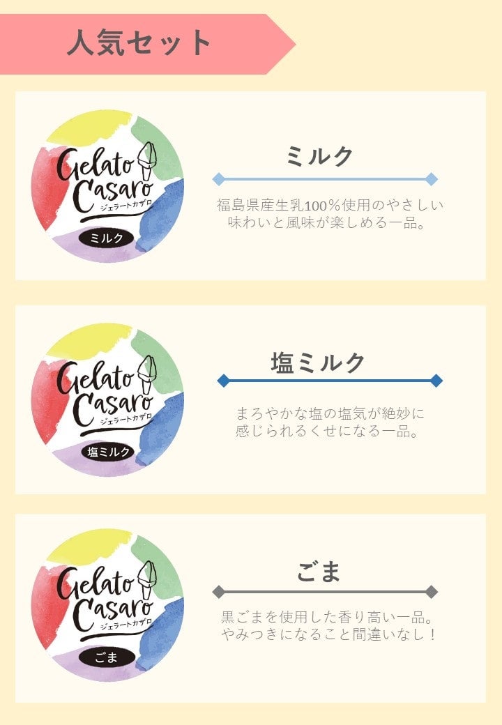 福島県産生乳を使用したジェラート。特に人気の3種類の詰め合わせセットです!