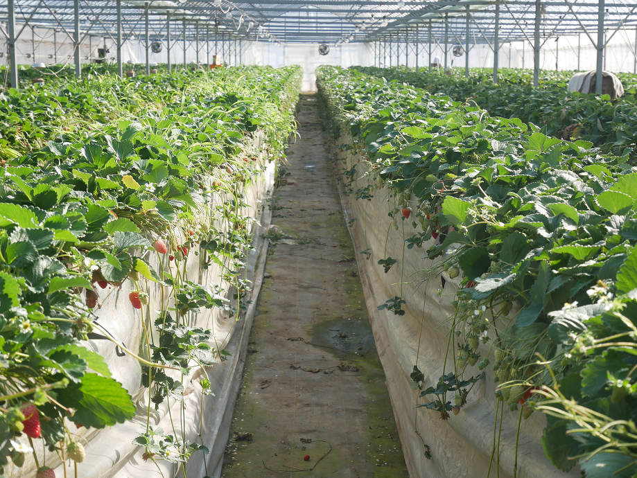 いちごのハウス内の様子です。 広いハウス内で栽培されるたくさんのいちごは、 食べ頃を逃さないようベストタイミングで収穫されます。