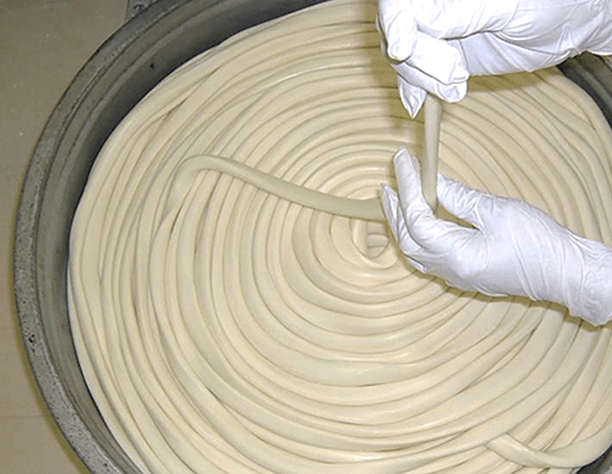 練りに練り、こねにこねた生地を人の手で延ばして、