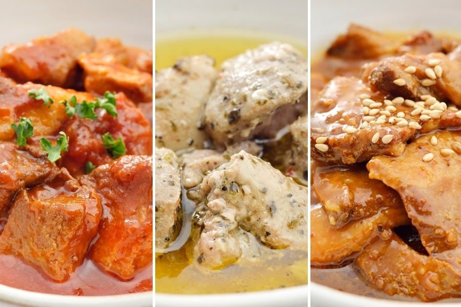 (角煮、アヒージョ、しょうが煮、トマトソース煮、塩バジル、味噌煮)