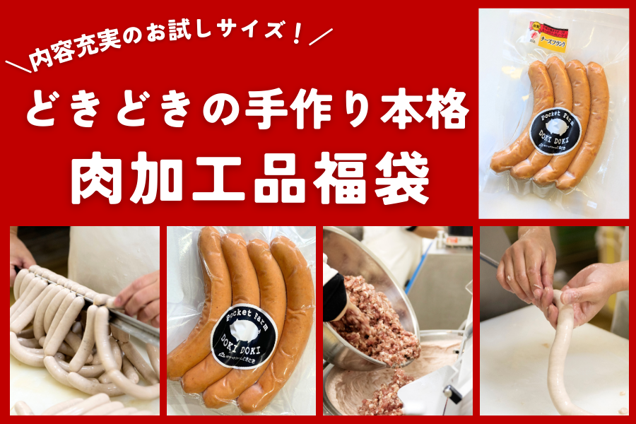 ポケットファームどきどきがつくるソーセージは、 「第1回IFFA日本食肉加工コンテスト2019」及び 「2022年度日本IFFAコンテスト」で 最も評価の高い金賞を受賞したソーセージです。 こちらの福袋は、 職人が作る本場ドイツの本格的なソーセージや こだわりのベーコン、ハンバーグをセットにした 直売所の人気商品盛りだくさんの商品です! 茨城の銘柄豚「ローズポーク」を使用した 職人の『手作り本格・お肉の加工品福袋』を ぜひご堪能ください。