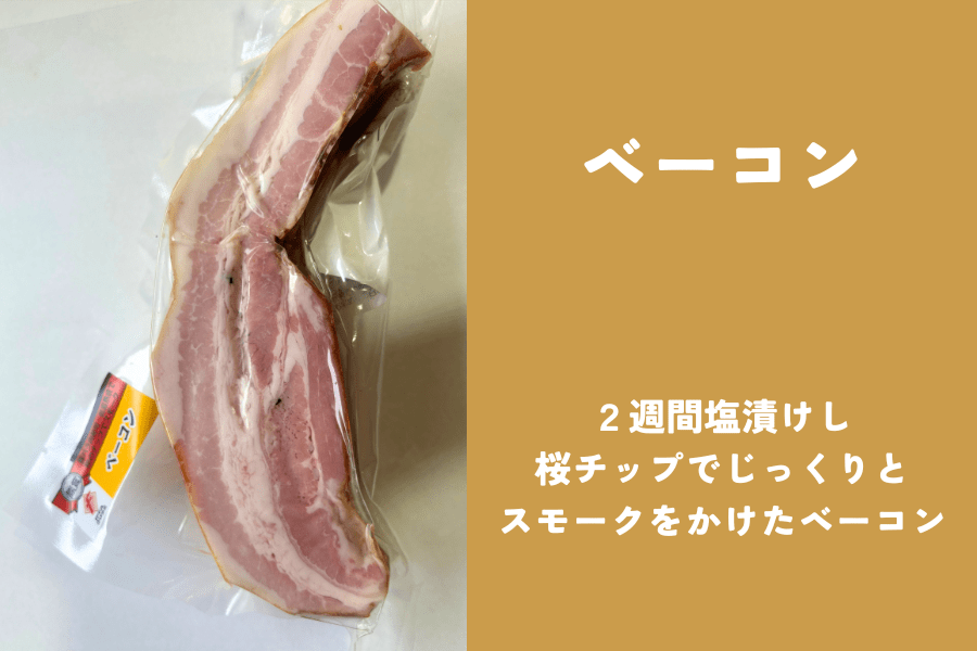 2週間塩漬けし、桜チップで じっくりとスモークをかけたベーコンです。 ○「ローズポーク」使用