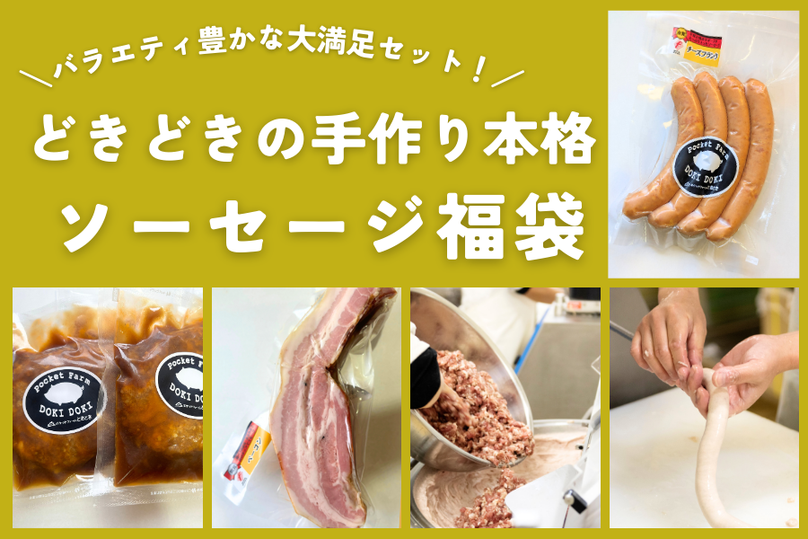 ポケットファームどきどきがつくるソーセージは、 「第1回IFFA日本食肉加工コンテスト2019」及び 「2022年度日本IFFAコンテスト」で 最も評価の高い金賞を受賞したソーセージです。 こちらの福袋は、 職人が作る本場ドイツの本格的なソーセージや こだわりのベーコン、ハンバーグをセットにした 直売所の人気商品盛りだくさんの商品です! 茨城の銘柄豚「ローズポーク」を使用した 手作りソーセージ・ベーコン・ハンバーグを ぜひご堪能ください。