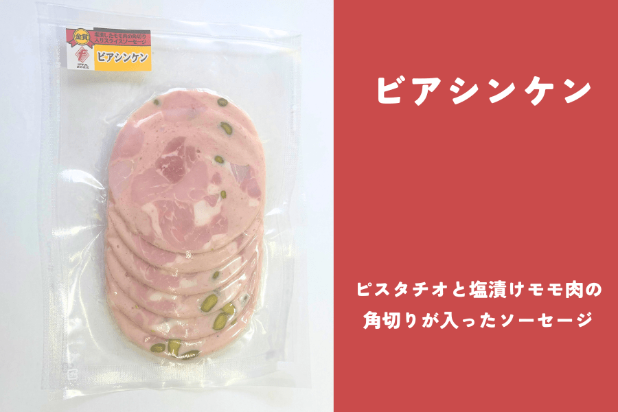 • Cビアシンケン:ピスタチオと塩漬けモモ肉の角切りが入ったソーセージ