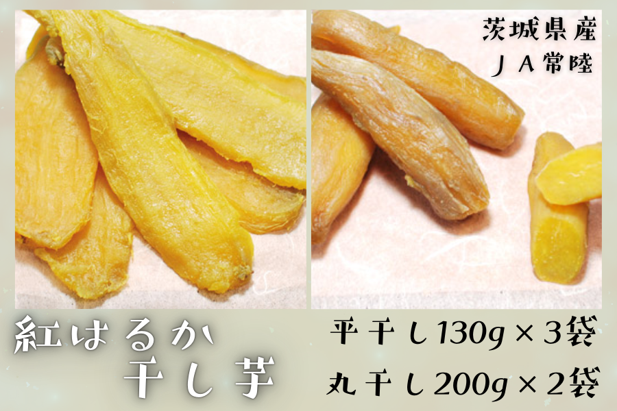 茨城県から、紅はるかの干し芋「平干し3袋、丸干し2袋」の食べ比べセットをお届けします!