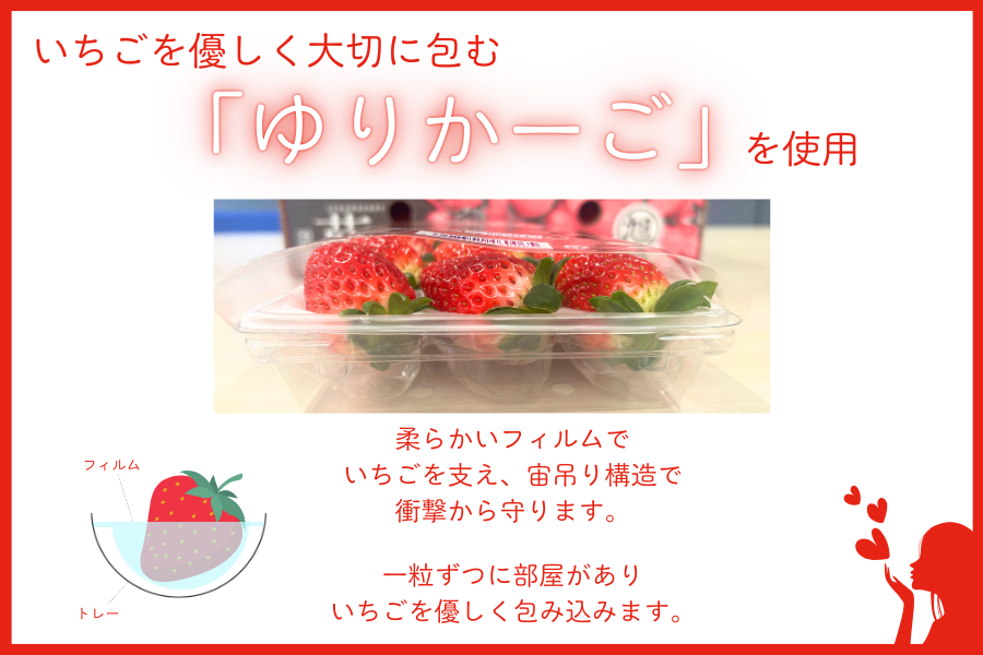 いばらキッスは適度な硬さとジューシーな味わいが特徴ですが、宅配に向くほど果肉の硬い品種ではないので、輸送時に傷みやすいという課題がありました。こちらの商品は、まるでゆりかごのような宙吊り構造で優しく包む「ゆりかーご」という特別な容器で、いばらキッスを輸送の衝撃から守り、全国の皆様へお届けします。