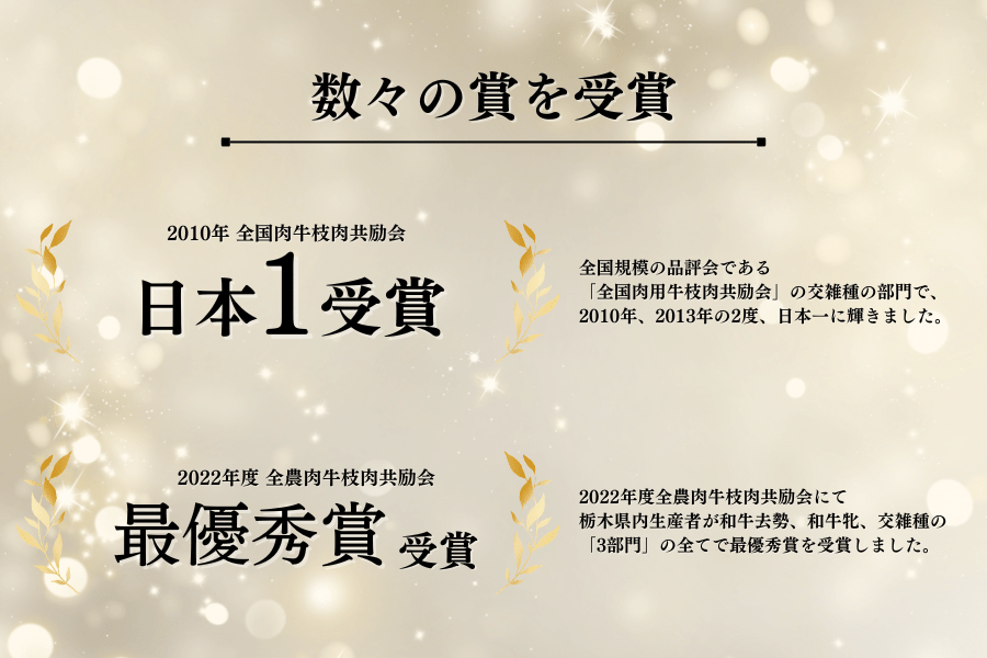 全国規模の品評会である全国肉牛枝肉共励会の交雑種の部門で平成22年、25年度と2度、日本一に輝いております。