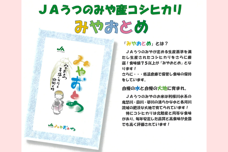 JAうつのみやが定める生産基準を満たし生産されたコシヒカリをさらに厳選!食味値75以上が「みやおとめ」となります!