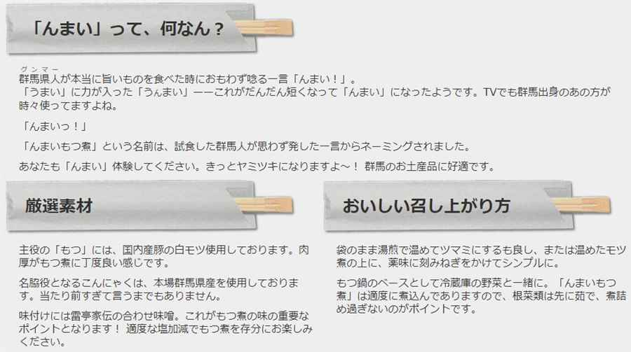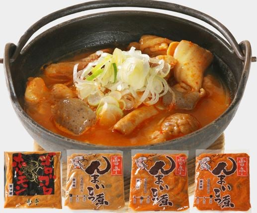 んまいもつ煮ホルモン入セットです!! 家伝の合わせ味噌を使い、じっくり煮込んだ逸品です! ※んまいとは・・・・ 群馬県人(グンマ―)が本当に旨いものを食べた時に思わず唸る一言「んまい!!」 「うまい」に力が入った「うんまい」、これがだんだん短くなって「んまい」になったようです! 「んまいもつ煮」は試食した群馬県人が思わず発した一言からネーミングされたそうです! 【おいしい召し上がり方】 温めたもつ煮の上に刻みネギをかけてシンプルにしたり、もつ鍋のベースとして冷蔵庫の野菜と一緒にいただいたりするのがオススメです! ゴロゴロホルモンは、フライパンや鉄板、炭火等で焼いてお召し上がりください! <セット内容> ・んまいもつ煮(甘口) 2個 ・んまいもつ煮(辛口) 2個 ・ゴロゴロホルモン 1個 計5個 <んまいもつ煮各種> 原材料名:豚肉(大腸、小腸)(国産)、蒟蒻(蒟蒻粉、海藻粉)、米味噌(大豆、米、食塩)、砂糖、 にんにく、香辛料、風味調味料(かつお等)/水酸化カルシウム、調味料(アミノ酸等)、 酒精、(一部に豚肉・大豆・ごまを含む) 内容量 :330g 賞味期限:製造日より45日 保存方法:要冷蔵(10℃以下にて保存してください) <ゴロゴロホルモン 1個あたり> 原材料名:豚肉(大腸、小腸)(国産)、砂糖、にんにく、香辛料(一部マレーシア産)、米味噌(大豆・ 米・食塩)、風味調味料(カツオ等)、醤油(食塩)(メキシコ製造、国内製造)(脱脂加工大豆) (分別生産流通管理済み)小麦、大豆(分別生産流通管理済み)/調味料(アミノ酸等)、酒精、 (一部に腸肉・大豆・ごまを含む) 内容量 :300g 賞味期限:製造日より45日 保存方法:要冷蔵(10℃以下で保存してください)