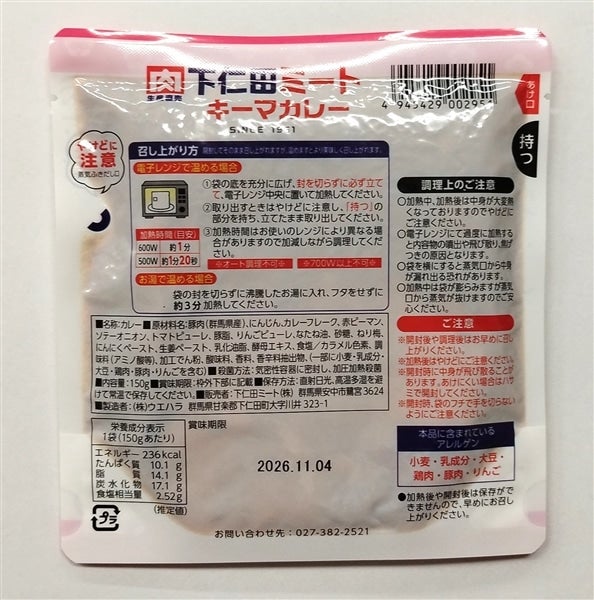 ■原材料名:豚肉(群馬県産)、にんじん、カレーフレーク、赤ピーマン、ソテーオニオン、トマトピューレ、豚脂、りんごピューレ、なたね油、砂糖、ねり梅、にんにくペースト、生姜ペースト、乳化油脂、酵母エキス、食塩/カラメル色素、調味料(アミノ酸等)、加工でん粉、酸味料、香料、香辛料抽出物、(一部に小麦・乳成分・大豆・鶏肉・豚肉・りんごを含む)