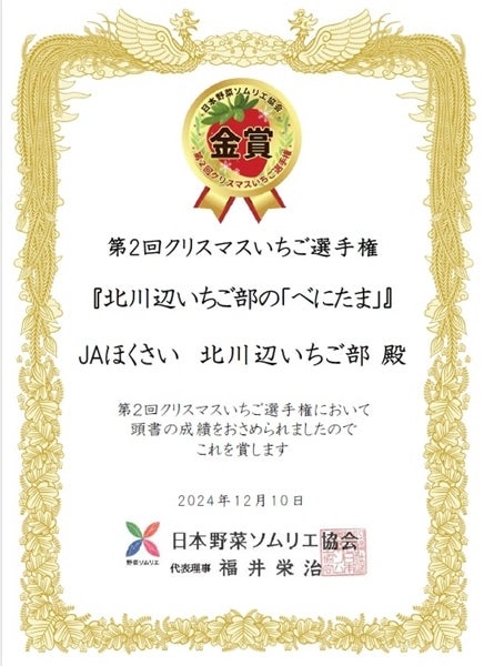JAほくさい北川辺いちご部では高品質・食味重視の化学農薬に頼らない栽培を目指しています。第1回クリスマスいちご選手権では「最高金賞」、第2回クリスマスいちご選手権では「金賞」を受賞することができました。