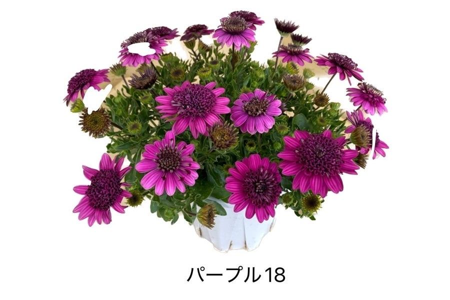 パープル18!八重咲きのオステオスペルマムで、シックな紫色の最新品種。豪華な見た目と丈夫が人気です。