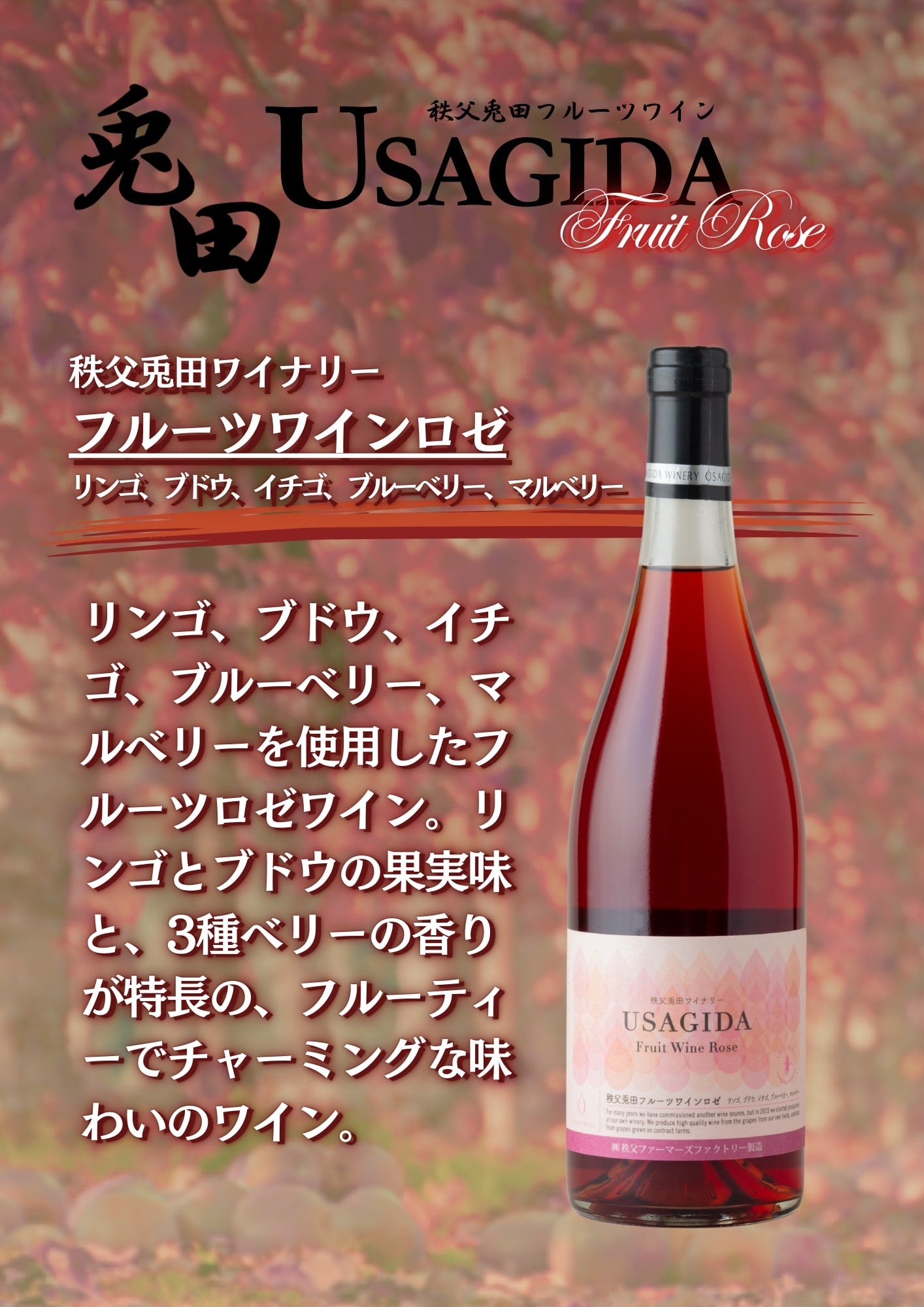 リンゴ、ブドウ、イチゴ、ブルーベリー、マルベリーを使用したフルールロゼワイン。3種のベリーの香りが特徴のフルーティな味わいのワイン。