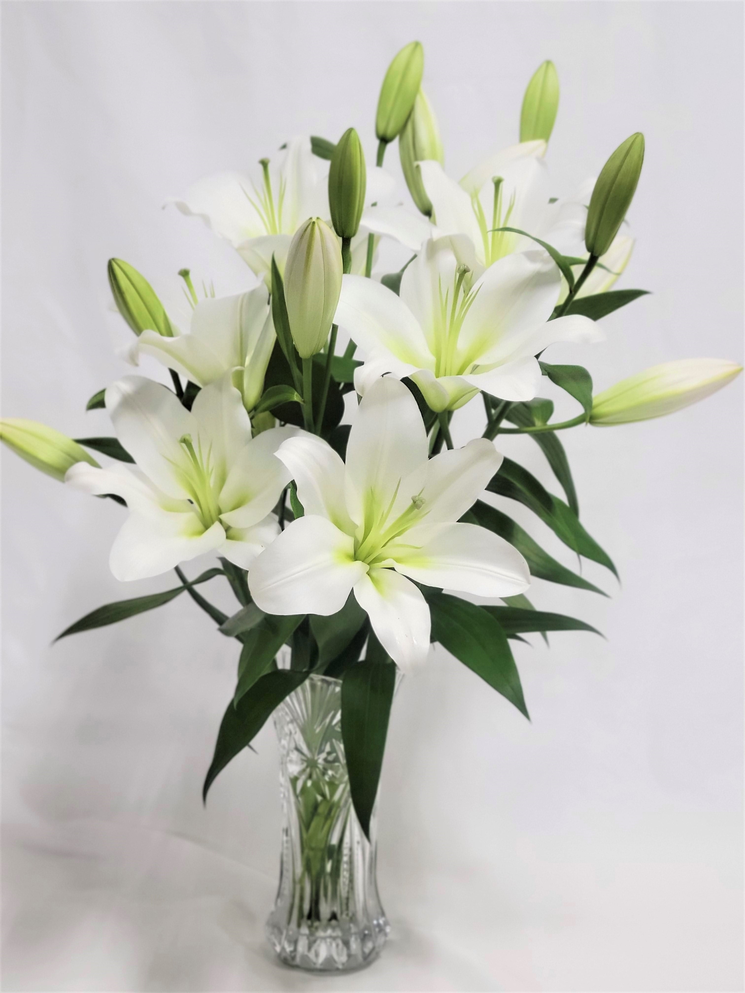 清楚で上品な白いユリ。お部屋を明るく、癒しの空間へと演出してくれま す。ぜひご家庭で『ユリのある暮らし』をお楽しみください。