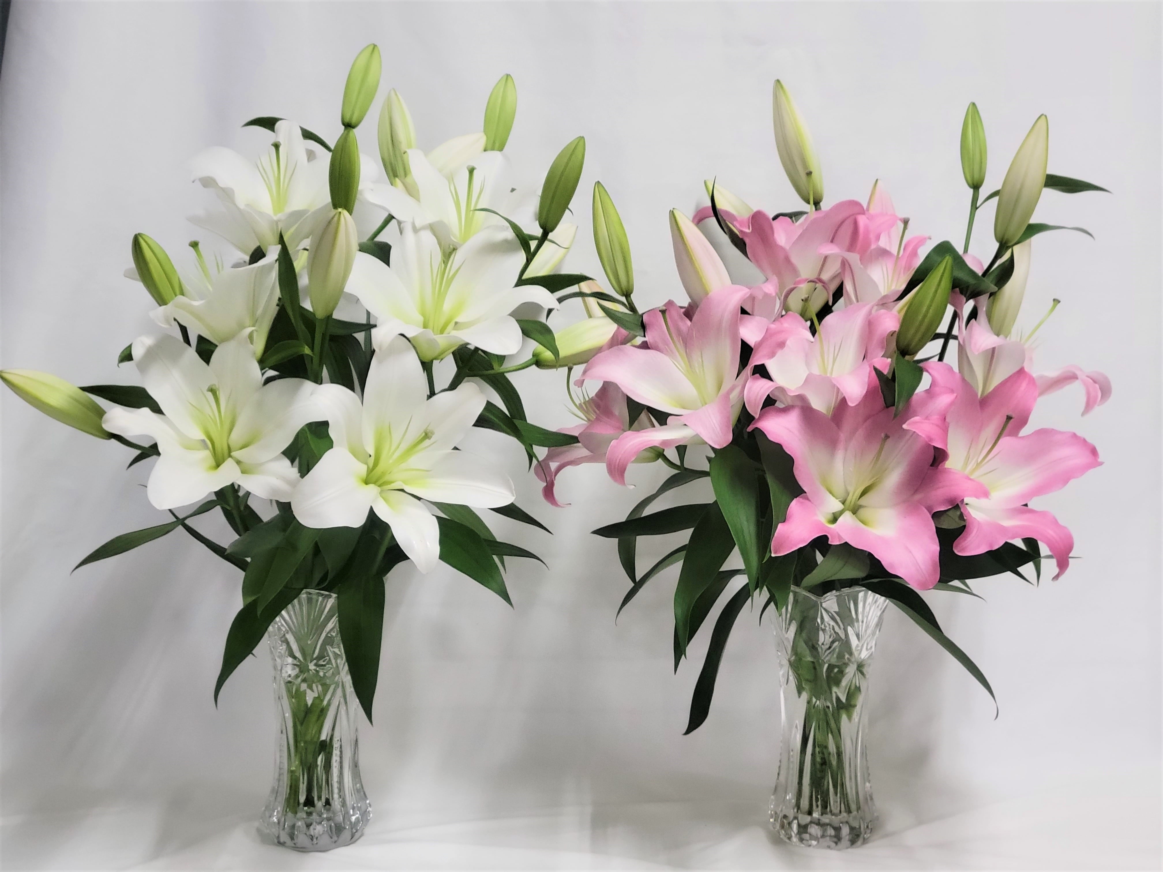 ◆内容:4-5輪付きオリエンタルユリ 10本 ◆お色:2色(白・ピンク) ◆花丈:80p ◆香り:最近は香りを抑えた品種が主流となっており、お顔を近づけていただきますと優しく香ります。(気候や品種によっても個性がございますので、ぜひ違いもお楽しみください。) ◆品質を保つため、ユリの足元へ保水ゼリーをお付けしております。商品が届きましたら、速やかに開封し、保水ゼリーを洗い落とし、水切りをしてから花瓶などへいけてください。