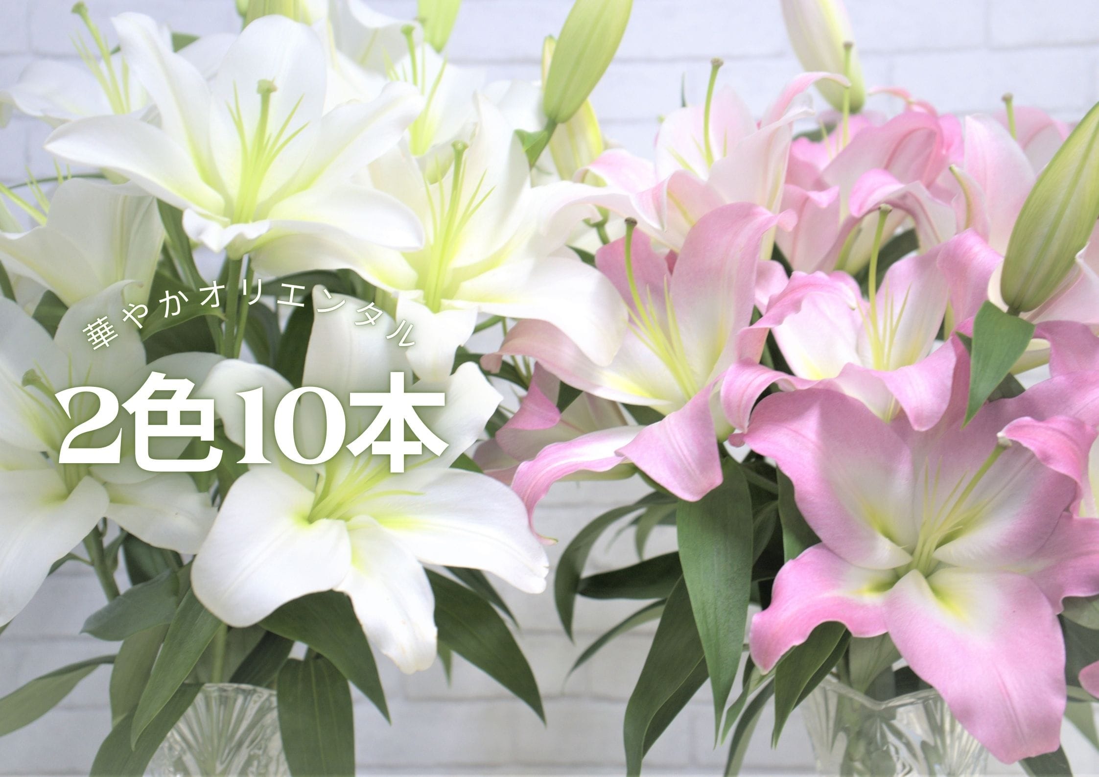 こちらの商品は、「華やかオリエンタルユリ 2色10本」となります。 注文確定から生育状況に応じて順次発送します。 品種の指定、ラッピングは対応しておりませんので、ご了承願います。