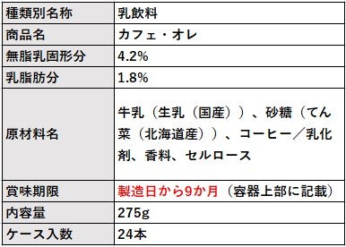 牛乳をたっぷり50%以上使用し、北海道産のてん菜糖によるやさしい甘さが特徴的なカフェ・オレに仕上げています。
