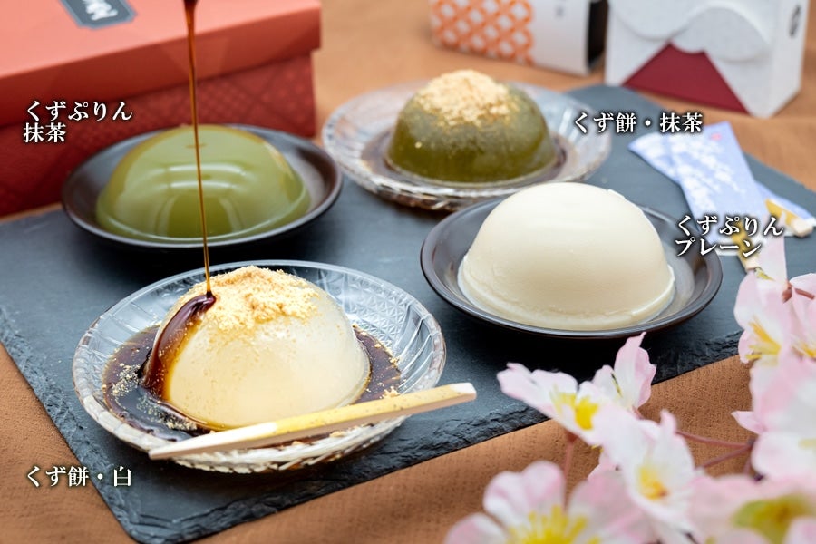 『くず餅(白、抹茶)』『くずぷりん(プレーン、抹茶)』をセットでお届け〈化粧箱入り〉