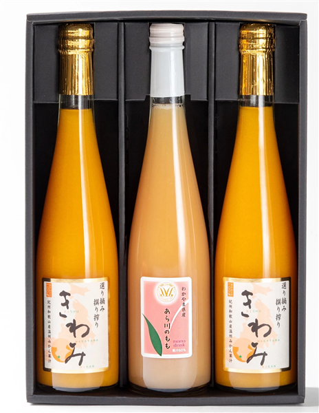 「きわみ」 濃厚100%ストレート&あら川の桃のドリンク アソートギフトセット ・「きわみ」 2本 ・あら川の桃のドリンク 1本 2種類のお味が楽しめるセットです。 ギフトにもおすすめ。 ※きわみ1本&桃2本の組み合わせもございます。 詳しくは商品ページをご覧ください。 〇「きわみ」 濃厚100%ストレート〇 400年以上の歴史を持つみかんの名産地 和歌山県有田。 その中でも、本物のみかんを作り続け、我が子のようにみかんを育てている農家さんに自ら足を運び、自らの目と舌で確認したみかんしか使わない! あえて昔ながらの、手作業にこだわることで、みかん1つ1つの状態を見極める、徹底したこだわり! 100%ストレート果汁! 選り摘み、撰り搾り みかんジュース ‘‘きわみ” 酸味と甘みのバランスが絶妙な温州みかん、樹上完熟の温州みかんを中心に原料としております。 手作業で一つ一つみかんの外皮をむいて果肉を丸ごと絞り、糖度は約11.5度〜13度のものをブレンド。 まるでみかんを食べているかのような味わいの濃厚なとろみがある100%ストレートみかんジュースに仕上げております。 〇あら川の桃のドリンク〇 桃山町と地名がつくほど、長い歴史がある町、あら川地区で育った完熟の桃を使った「ももドリンク」 あら川の桃は、ジューシーで甘く風味が豊かなことで非常に人気のある桃です。 そんな完熟のあら川の桃を、手作業にて丁寧に果実をカットし、桃の香りや風味を損なわないように絞り上げました。 果実60%の無香料で優しい風味を味わっていただけます。