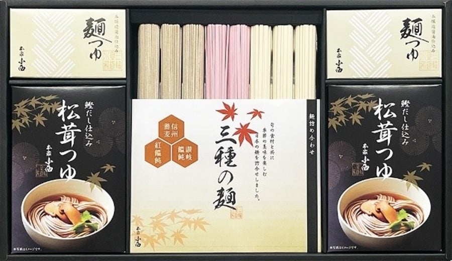 うどんやそばに、麺つゆと具材のはいった松茸つゆを詰合せました。