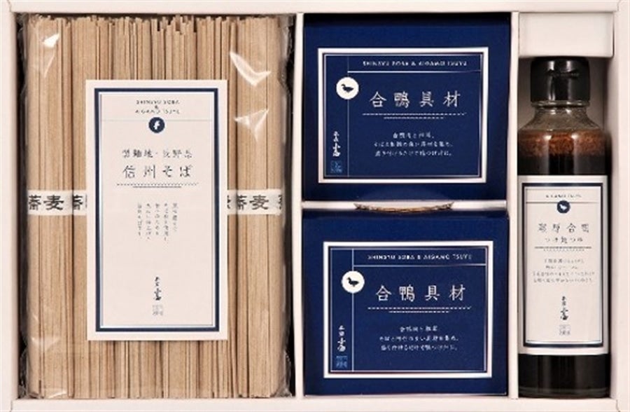 信州そばに合鴨つゆと具材(合鴨肉・椎茸)を詰め合わせた商品です。