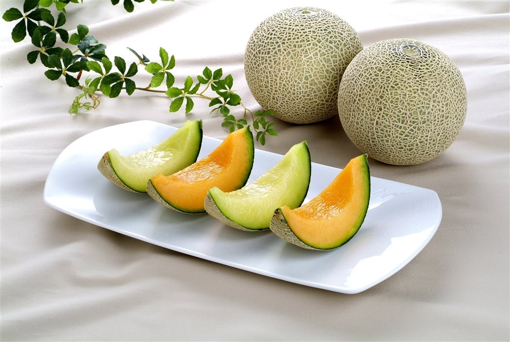 「アンデスメロン」は緑肉のネット系メロンで、芳醇な香りとコクのある高い糖度が特徴。「クインシーメロン」は濃いオレンジ色の果肉で、とろけるような濃厚な甘さが特徴。