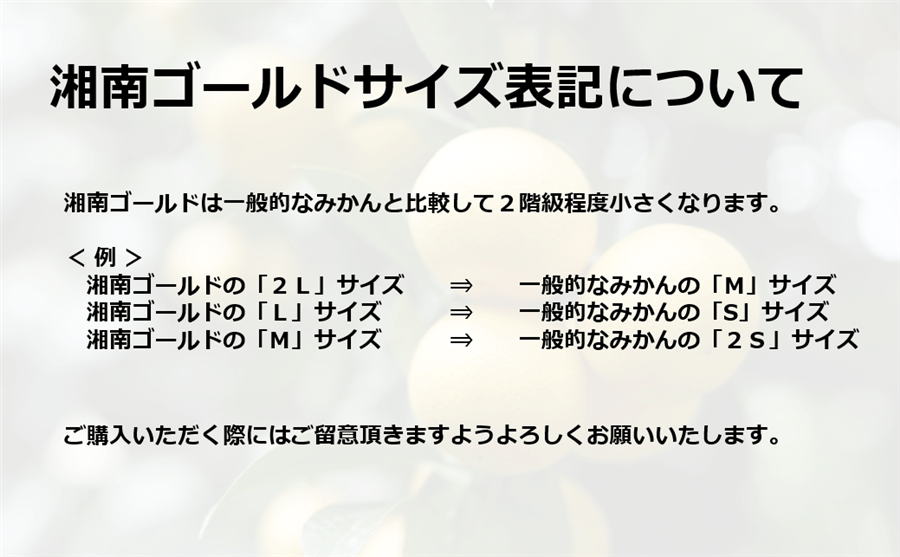 ※ 湘南ゴールドは一般的なみかんより2階級程度小さいサイズとなっております。湘南ゴールドの「2L」サイズがみかんの「M」サイズに相当いたします。