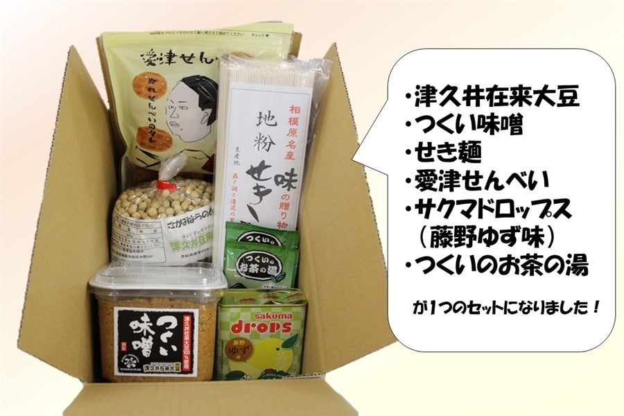 「あぐりんずつくい」は、JA神奈川つくいの直売所です。 圏央道相模原ICからほど近い神奈川県の端っこに位置しており、中山間地の特性を生かしたおいしい農畜産物・加工品をそろえております。 そんな「あぐりんずつくい」の魅力をお届けする“つくいボックス”が出来ました! 津久井在来大豆 【原材料名】大豆 【賞味期限】包装後180日 【保存方法】直射日光を避け、常温で保存ください。 つくい味噌 【原材料名】大豆、米、食塩 【賞味期限】製造から6か月 【保存方法】直射日光を避け常温で保存 相模原名産 味の贈り物 地粉せき麺 【原材料名】小麦粉、食塩 ※本製品の製造ラインでは、そば、大豆を使用した製品も製造しています。 【賞味期限】製造から1年 【保存方法】高温多湿を避けて常温で保存 愛津せんべい 【原材料名】うるち米(国産)、もち米(国産)、醤油(小麦・大豆を含む)、砂糖、水飴、清酒、発酵調味料、液体鰹だし、食塩、馬鈴薯澱粉、鰹顆粒/トレハロース、調味料(アミノ酸等)、増粘剤(加工澱粉)、アルコール、カラメル色素、酸味料、甘味料(ステビア) 【賞味期限】製造日より180日 【保存方法】直射日光、高温多湿の場所をお避け下さい。 サクマドロップス 藤野ゆず味 【原材料名】砂糖(国内製造)、水飴、炭酸飲料(果糖ぶどう糖液糖、ゆず果汁、砂糖、はちみつ)/酸味料、香料、着色料(紅花黄)、炭酸、ビタミンC 【賞味期限】製造から1年 【保存方法】直射日光や高温多湿の場所を避けて保存してください。・ つくいのお茶の湯 お茶の生産地として知られる相模原市旧津久井地域で育った茶葉を使用した入浴料です。