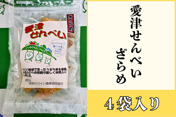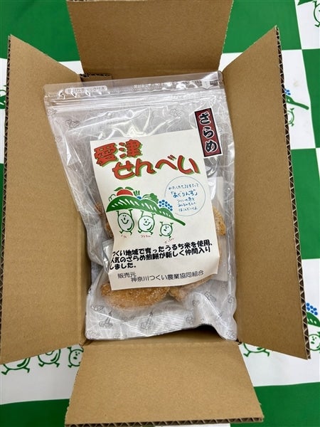 JA神奈川つくいのオリジナル商品「愛津せんべい」。ザクザク食感と優しい甘さが魅力のざらめ味です。