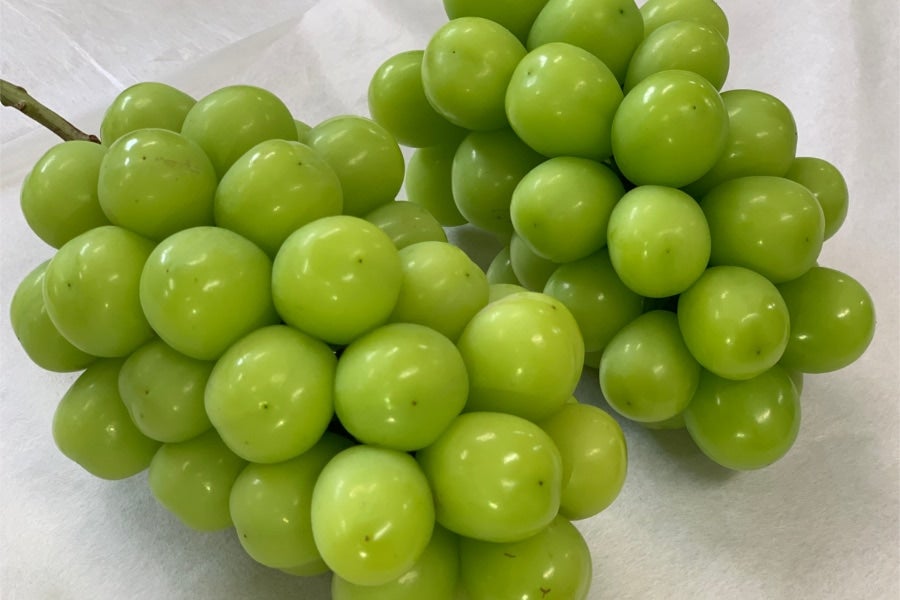 シャインマスカットは酸味が少なく、種無し、皮ごと食べられる品種です。