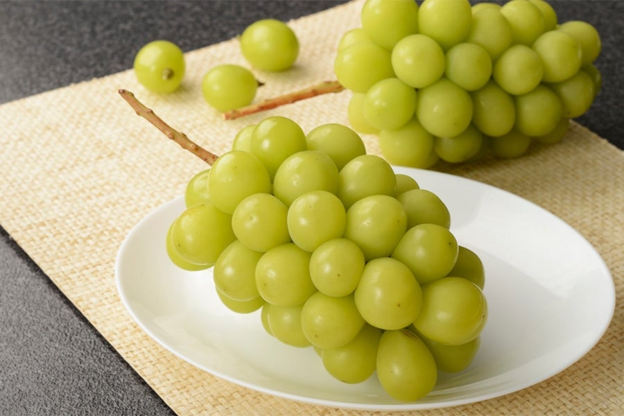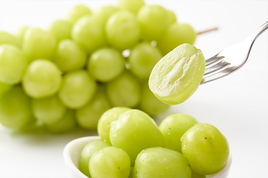 シャインマスカットは酸味が少なく、種無し、皮ごと食べられる品種です。