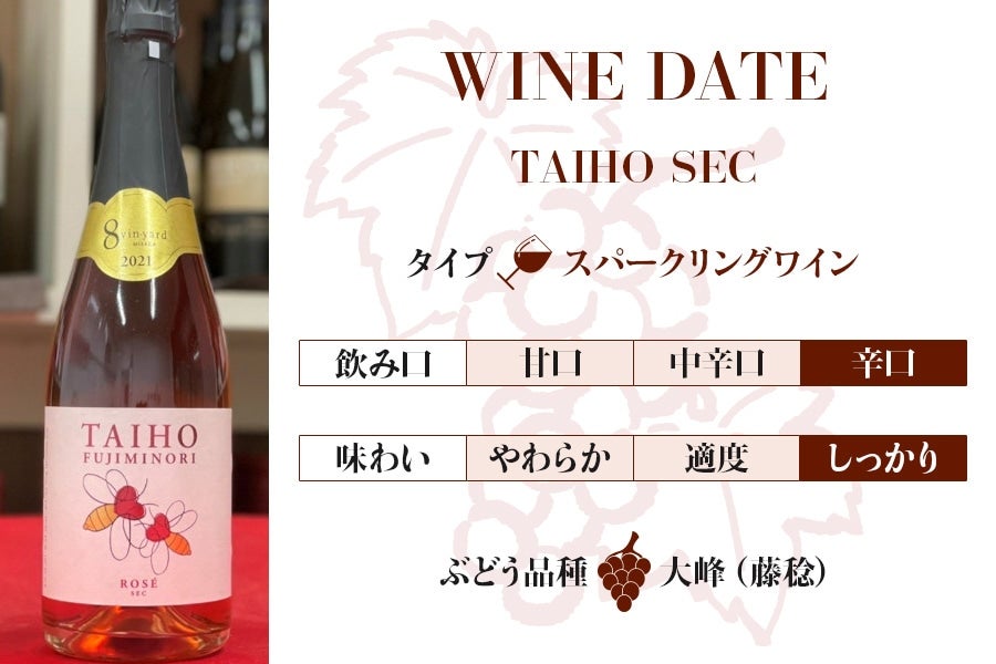 スパークリングワイン「TAIHO」は、山梨県笛吹市御坂町産の黒ぶどう品種の「藤稔」の中でも特に粒が大きく品質が厳選された「大峰」を使用しています。