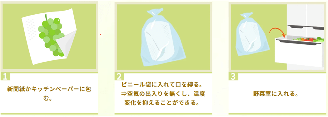 ブルームには乾燥を防ぎ、みずみずしさを保つ働きがあるので、洗わずに保存しましょう。
