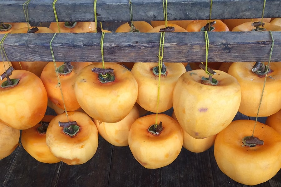 一つずつ手作業に作られる枯露柿(ころがき)は、飴色の美しさと、肉厚で甘く、食べると柔らかい食感で、最高峰の干し柿です。