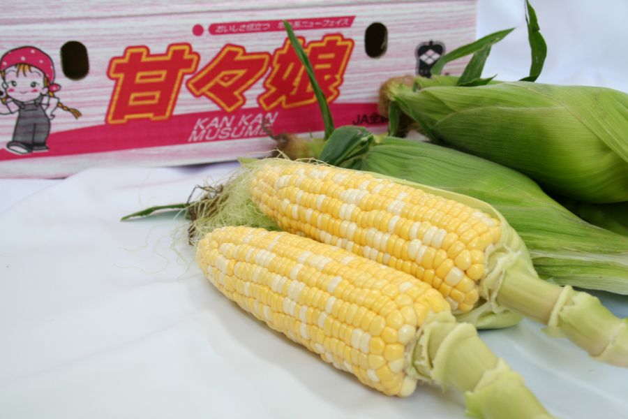 甘々娘(かんかんむすめ)は糖度が15度以上あり、生でも食べられるとうもろこしとして有名です。特徴としては名前のとおり『甘さ』が段違いで、スイーツコーン、フルーツコーンと呼ばれるほどです。黄色と白の粒が混ざるバイカラーコーンで、粒の皮が薄く、甘さが飛び出してきます。また、他の品種に比べ、時間経過による糖度の低下が遅いという優れた特質も持ち合わせています。