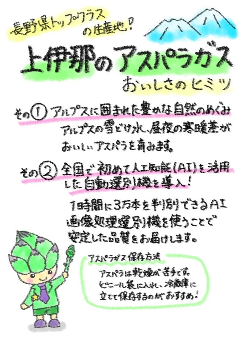 長野県は全国トップクラスのアスパラガスの一大産地であり、県内でもJA上伊那管内はアスパラガスの生産振興に力を入れており、県内一位の生産量を誇ります。この地域は、アルプスの雄大な山々からの雪解け水、昼夜の寒暖差が大きい内陸性気候の大地のめぐみ、生産農家の高い技術力により、みずみずしい春の味!おいしいアスパラガスを育みます。