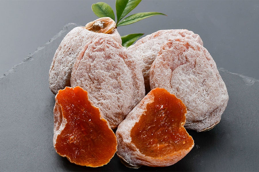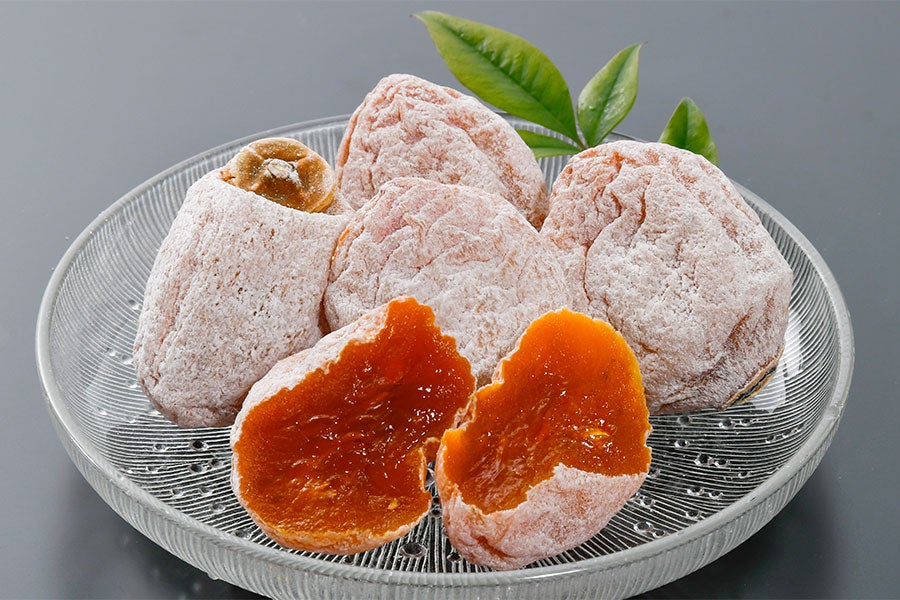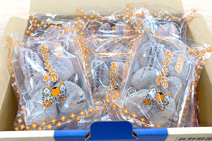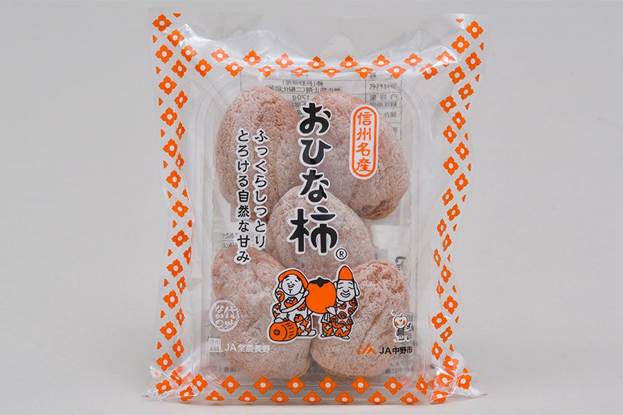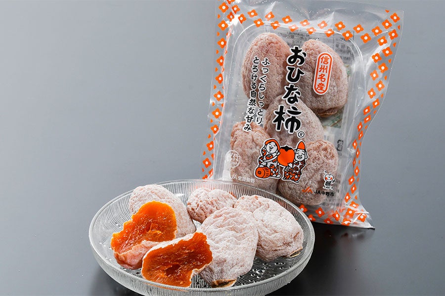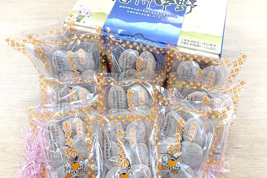 長野県中野市で栽培、加工される「おひな柿」は市田柿と同種の柿を用いた干し柿です。中野市は「土びな」と呼ばれる素朴な郷土人形が江戸時代からあり、素朴な可愛らしさを名称の由来とした干し柿です。