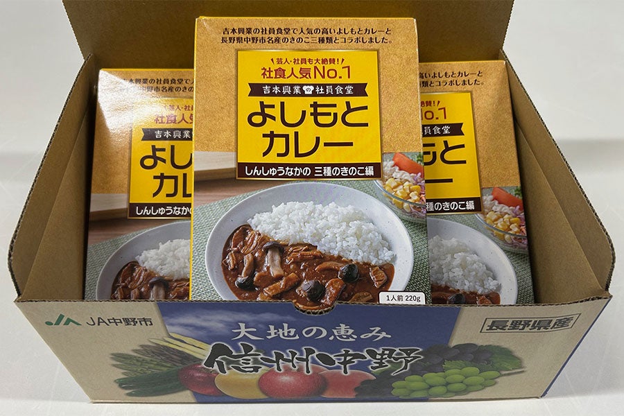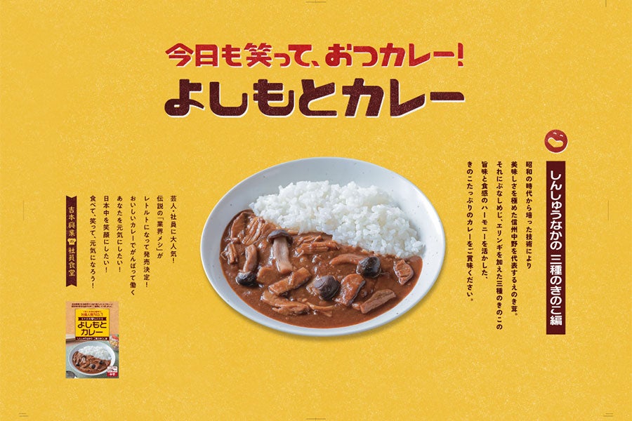 吉本興業の社員食堂で人気の高いよしもとカレーと長野県中野市産のきのこ三種類とコラボしたキノコたっぷりカレー。